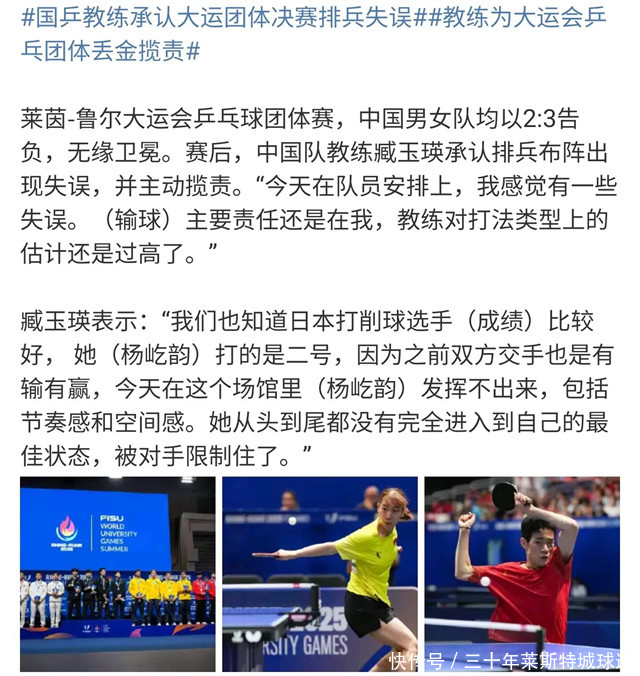 第32届寰宇大学生夏日开采会,中国乒乓球队亏欠惨重,男女团体决赛统共2-3失利而丢冠,激勉浩大争议。毕竟,在这种以年青梯队球员构成的外洋赛事中,中国队向来齐是称霸,如今我们在赢面如斯浩大的团体赛双双失利,确切是令东说念主难以采取。