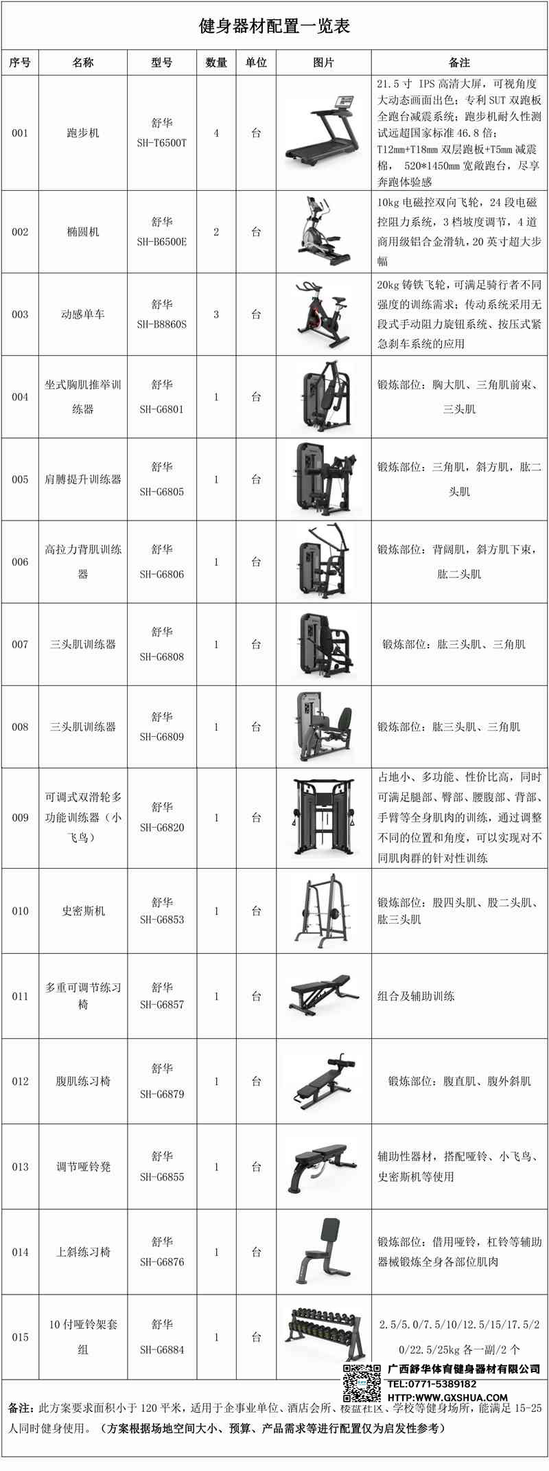 此方案要求面积小于120平米,适用于企事业单位、酒店会所、楼盘社区、学校等健身场所,能满足15-25人同时健身使用。(方案根据场地空间大小、预算、产品需求等进行配置仅为启发性参考)