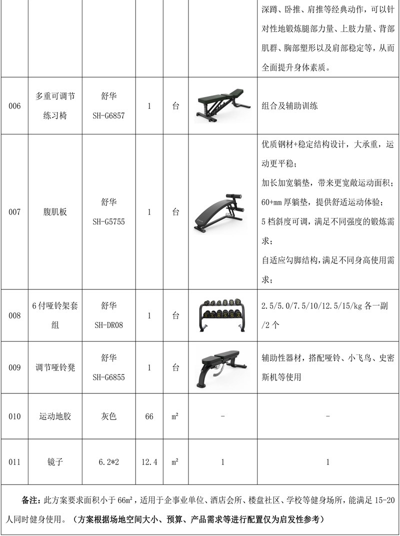 此方案要求面积小于66m²,适用于企事业单位、酒店会所、楼盘社区、学校等健身场所,能满足10-15人同时健身使用。(方案根据场地空间大小、预算、产品需求等进行配置仅为启发性参考)