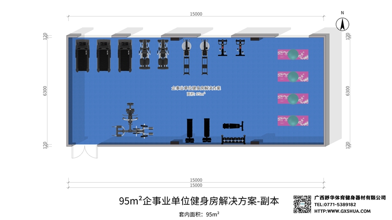 此方案要求面积小于95m²,适用于企事业单位、酒店会所、楼盘社区、学校等健身场所,能满足15-20人同时健身使用。(方案根据场地空间大小、预算、产品需求等进行配置仅为启发性参考)