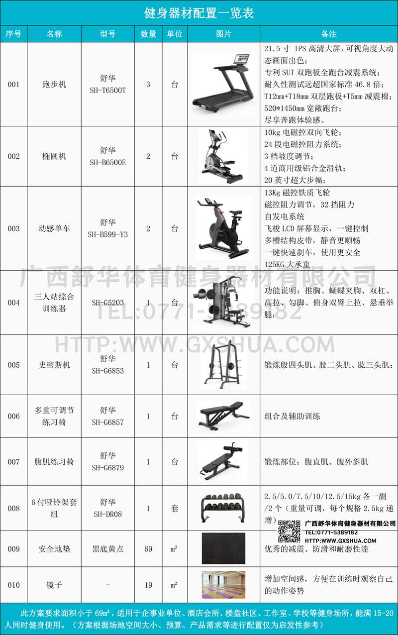 此方案要求面积小于69m²,适用于企事业单位、酒店会所、楼盘社区、工作室、学校等健身场所,能满15-20人同时健身使用。(方案根据场地空间大小、预算、产品需求等进行配置仅为启发性参考)