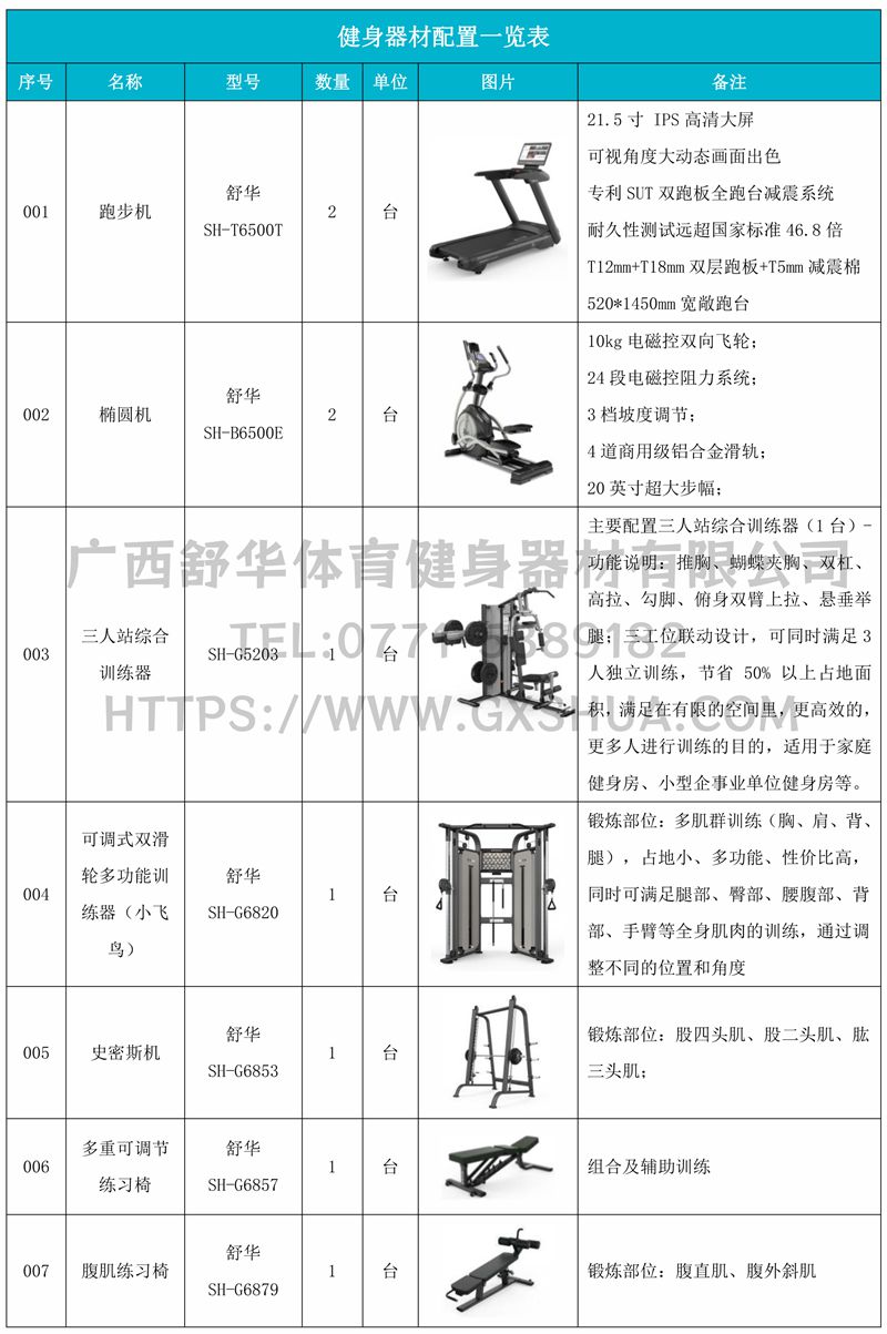 主要配置小飞鸟、史密斯机、多重可调节练习椅、10付哑铃套组、哑铃凳、腹肌训练器(各1台),可以实现对不同肌肉群的针对性训练,满足肌肉训练需求,全方位激活身体机能。